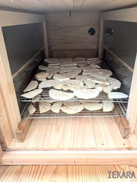 有機物や水に吸収されやすい遠赤外線の輻射熱の特徴をいかし、30~50℃で1℃間隔の設定可能な木製遠赤外線乾燥機です。