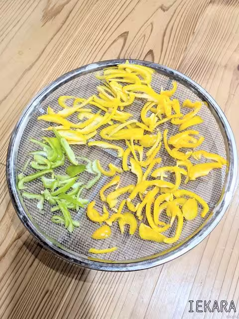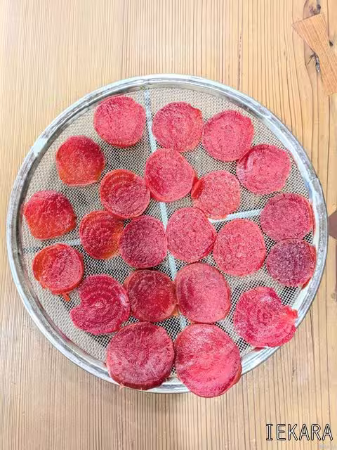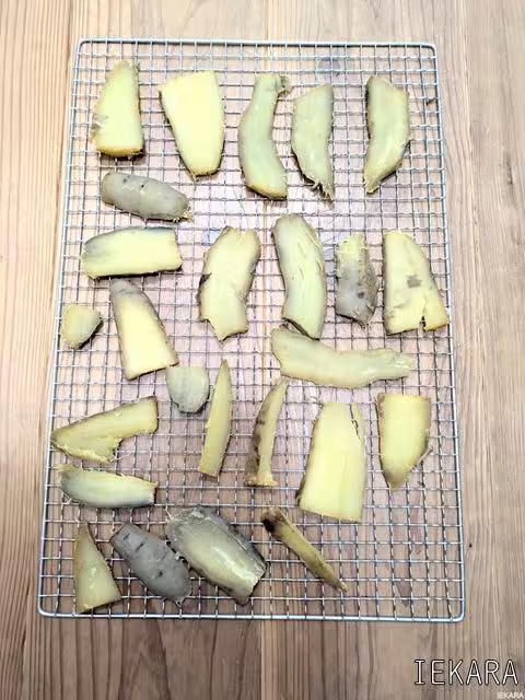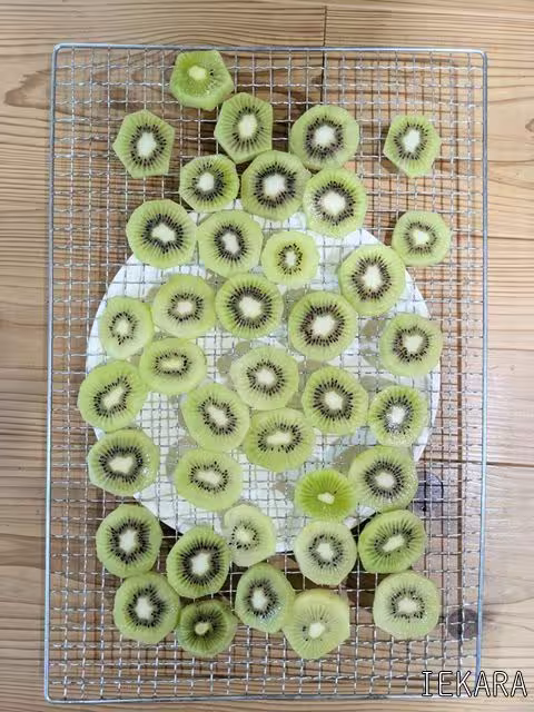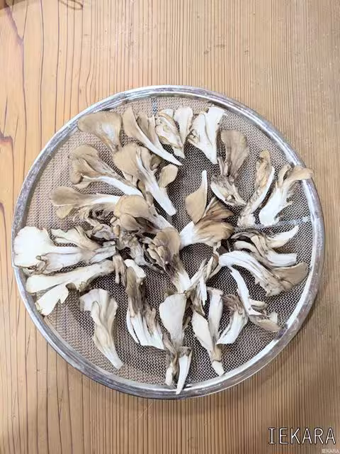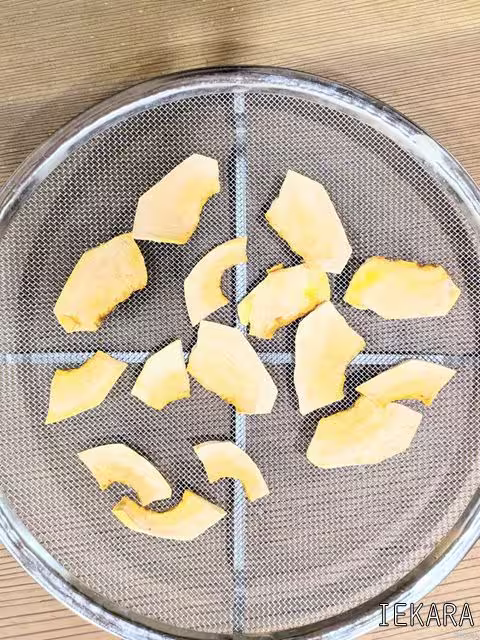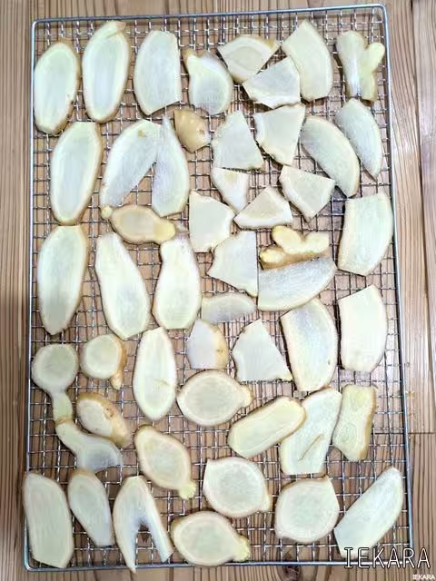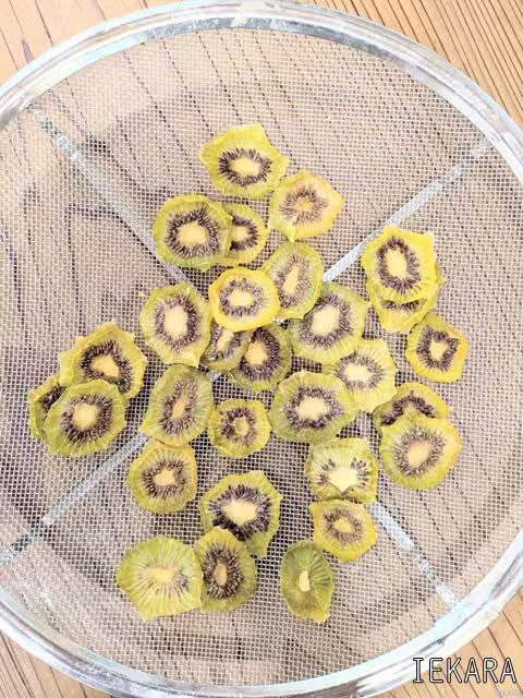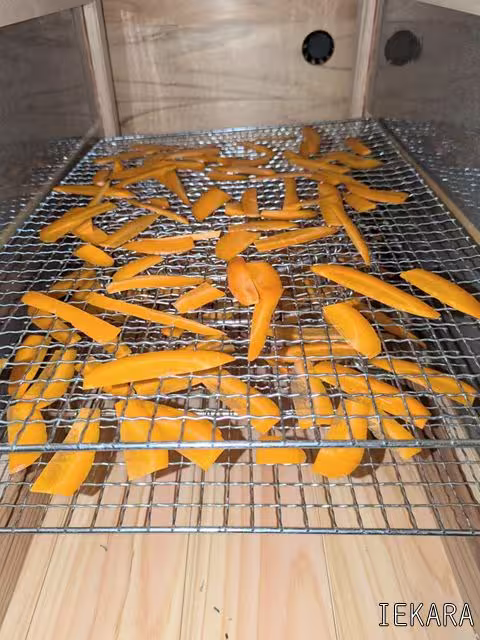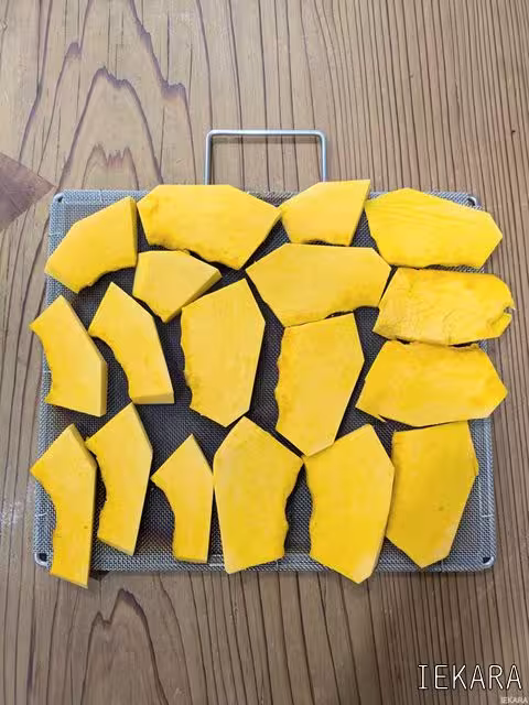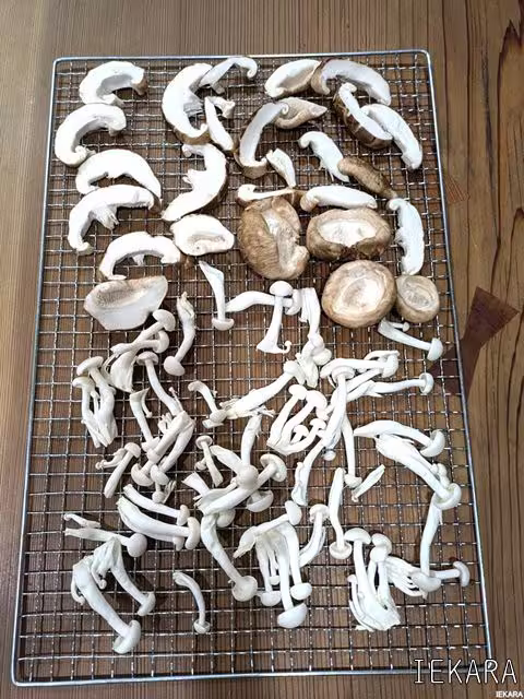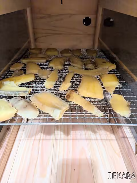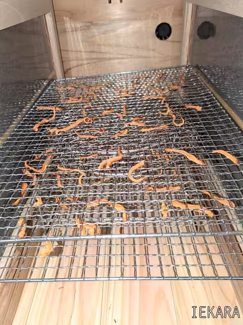 材料の水分量や形状にもよりますが、画像サイズの乾燥機で40℃設定にすると、2~3日で重量の1/10程度の乾物が出来上がります。